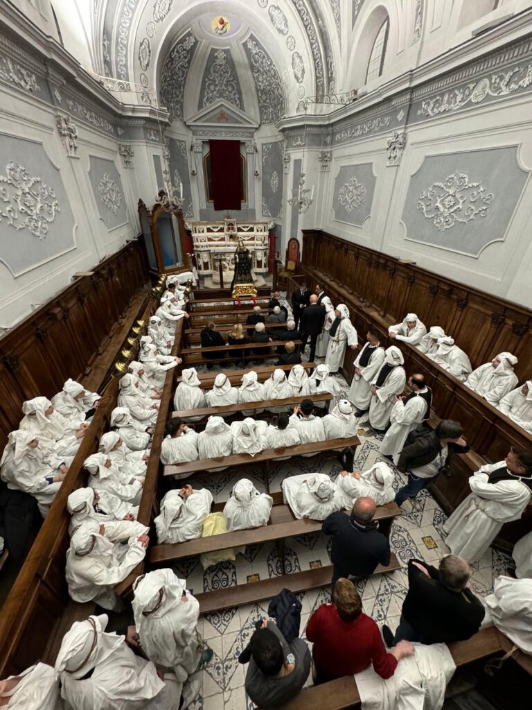 The silence that accompanies the procession is a tangible presence, broken only by the rustling of the brothers’ white robes. They are ghostly figures with their faces concealed by the buffa, the hood that erases individual identity to merge them into a single penitent entity. In ancient times, this anonymity was not merely an exercise in humility, but an arcane discipline of dignity: in the face of death, the nobleman and the fisherman became indistinguishable, settling their accounts with life in a rite that admitted no visible hierarchies. They carry the schiabica on their shoulders, a term that even today evokes fishing nets and archaic toil. In the language of their forefathers, the schiabica was the trawl net, the tool with which the people of Amalfi for centuries wrested life from the abyss. Applying this term to Christ’s funeral canopy means loading the Savior onto the city’s boat, making the sacrifice a matter of the sea, of waves, and of salt.